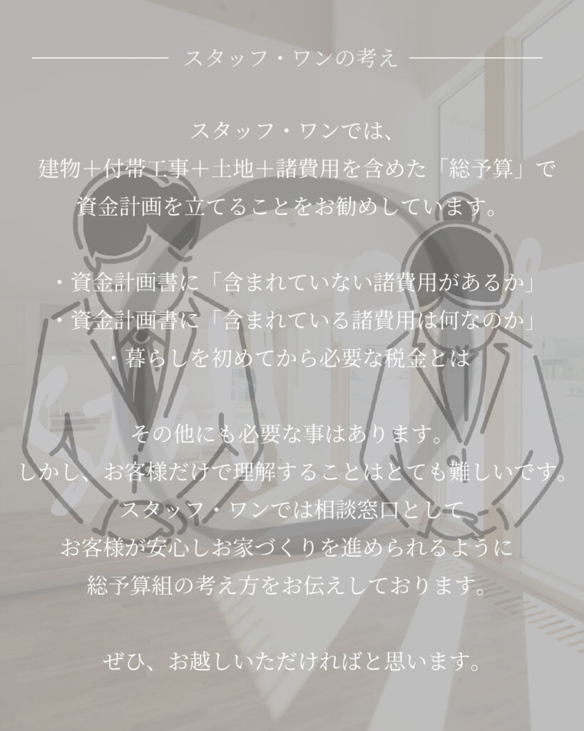 スタッフ・ワンでは、建物・付帯工事・土地・諸費用を含めた