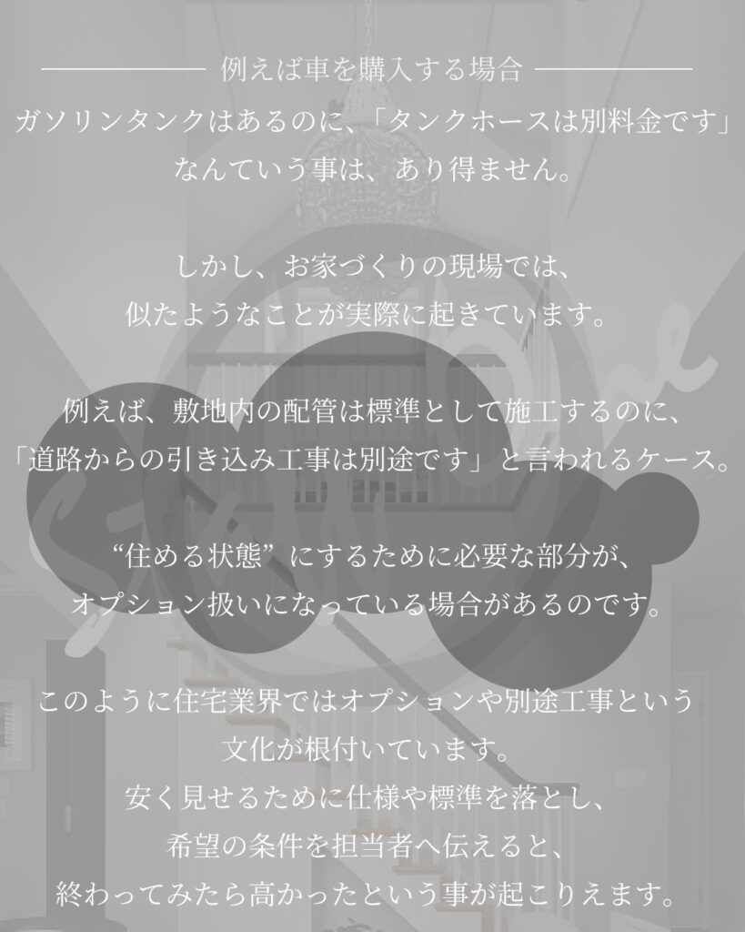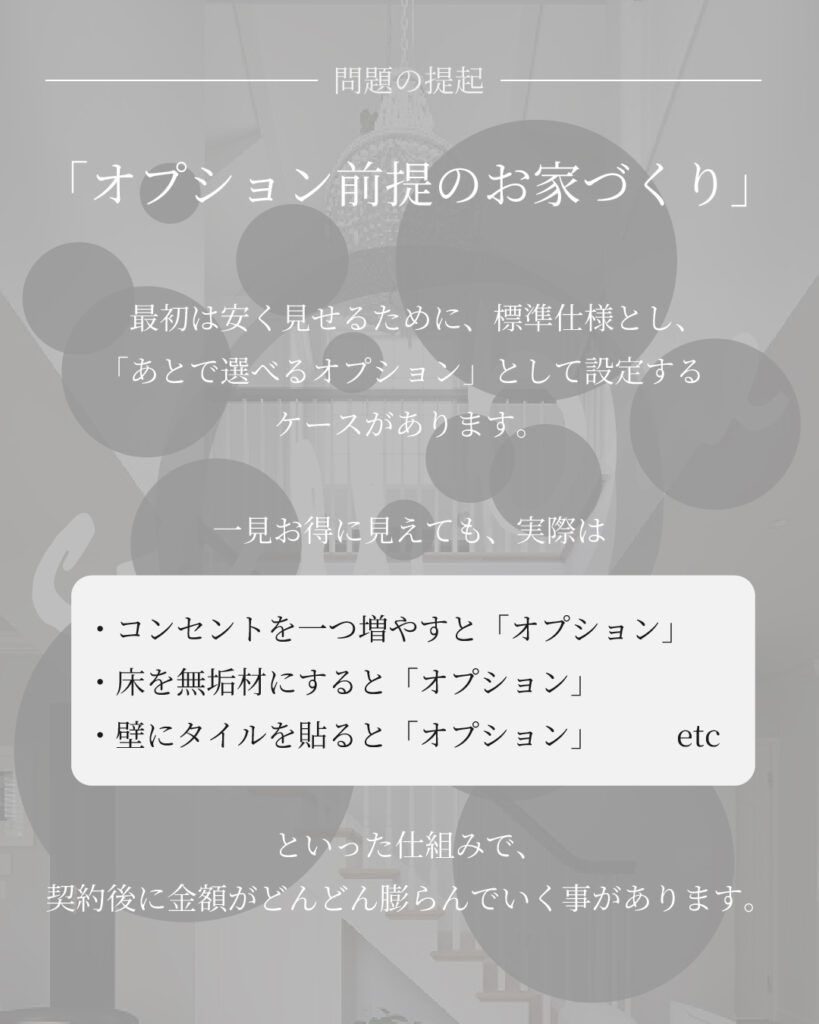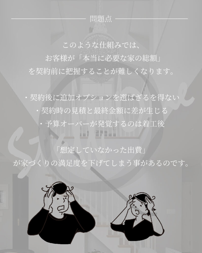 こうした仕組みでは、契約前に“本当に必要な家の総額”を把握できず、