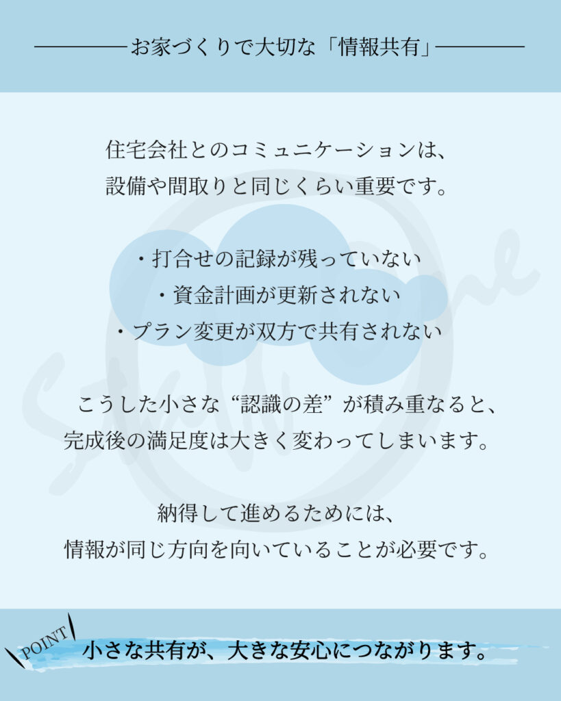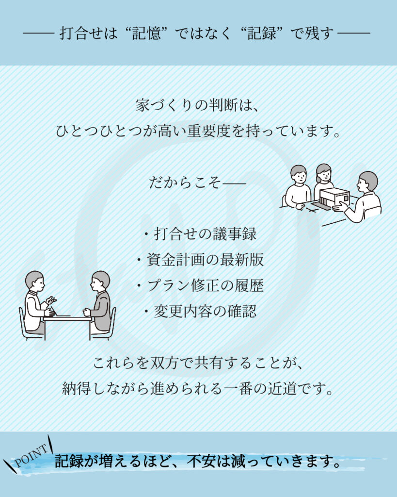 打合せの議事録、資金計画の最新版、プラン修正の履歴などを共有することで、